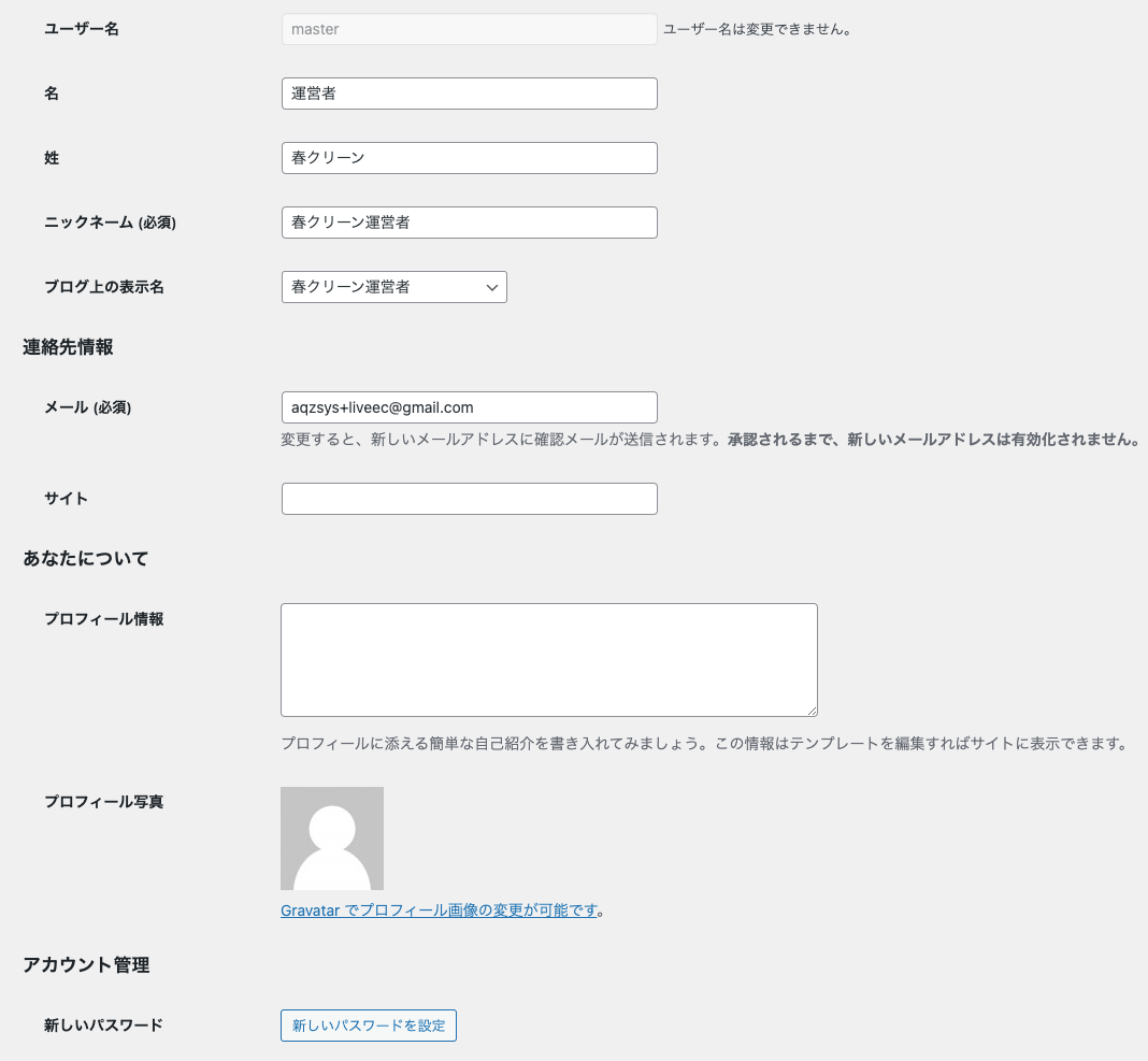 運営管理画面から【ユーザー名】>【プロフィール】をクリックします。